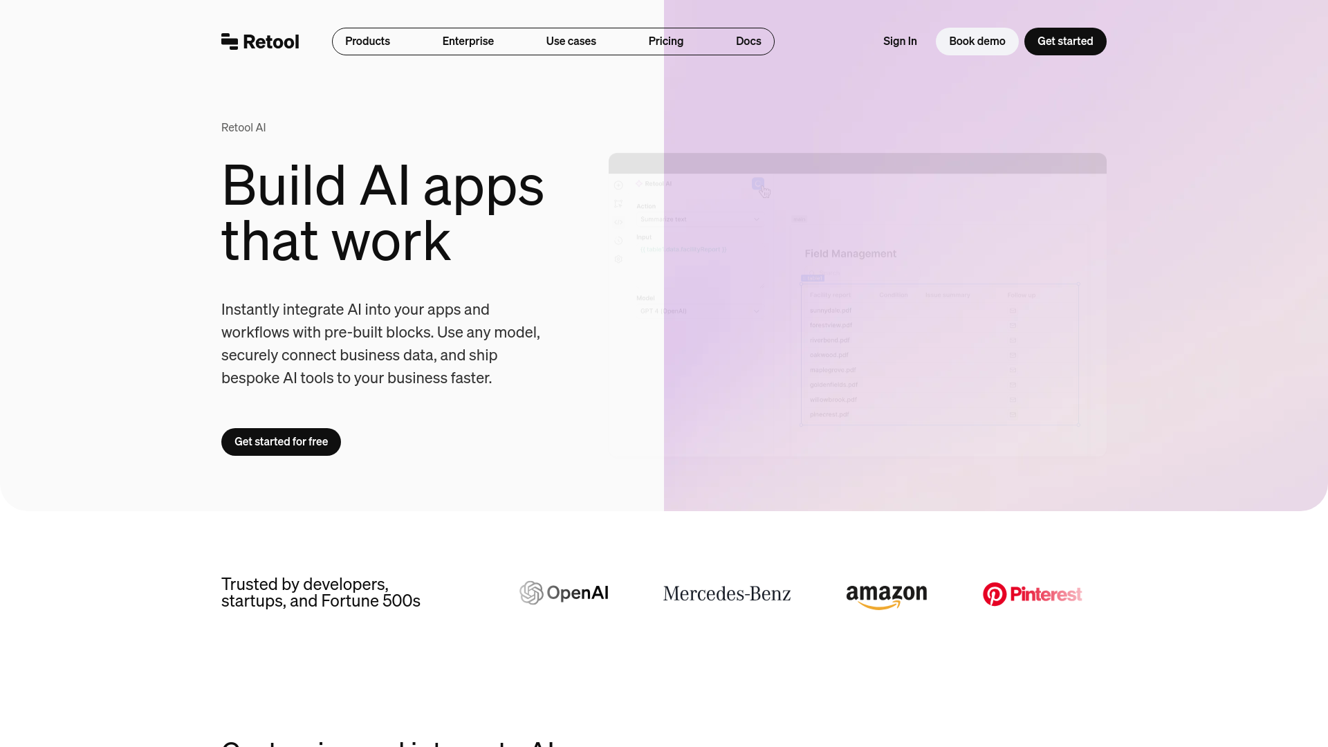 Customize and integrate AI into your business workflows in minutes with Retool. This platform allows you to build custom AI workflows by chaining together business logic, data connectors, and dynamic prompts to automate hundreds of manual tasks seamlessly. With support for OpenAI, Anthropic, and Azure, plus the flexibility to bring your own model and API keys, you can integrate dozens of pre-built AI actions to work with multimodal data, making AI integration swift and efficient. Retool's secure deployment features ensure your AI applications and data remain safe. You can deploy securely to developers and end-users, keeping data protected with self-hosted deployments, permissions, audit trails, SSO, and version control. This robust security infrastructure allows you to govern and carefully control how data is shared with LLMs, maintaining data integrity and compliance at every step. Harness the power of AI-enhanced developer tools and build custom business software faster than ever before with Retool. Generate code and debug faster by pairing with AI, generate intuitive user interfaces with AI-recommended UI blocks, and utilize over 100 pre-built components for creating bespoke, powerful applications. Automate and accelerate your development process, and ship AI-powered solutions that can transform and streamline your business operations.